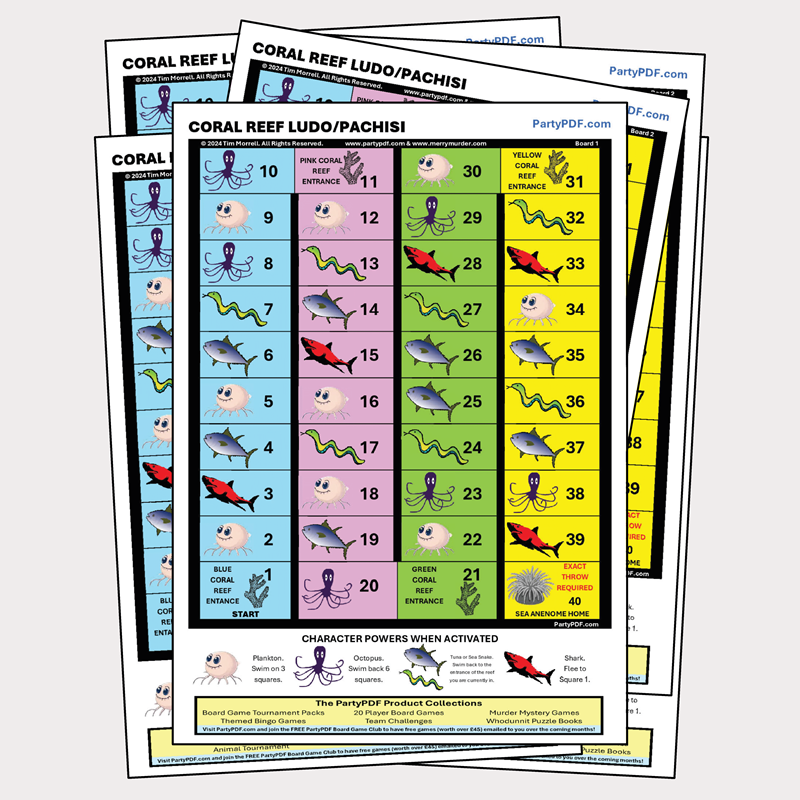 Each player has two playing pieces. These are placed on the square 1 start at the entrance to the Blue Reef.