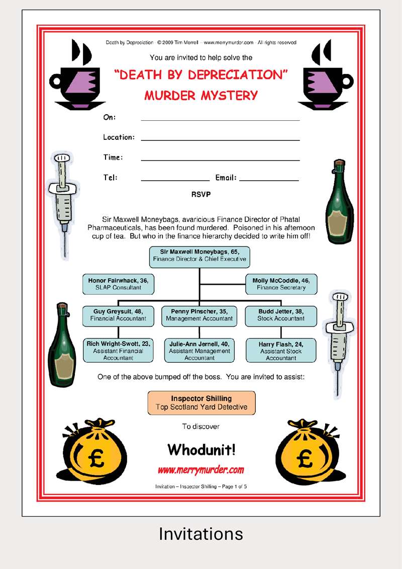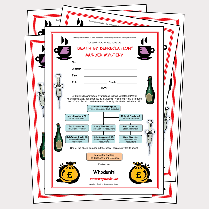Sir Maxwell Moneybags, 65, avaricious Finance Director at Phatal Pharmaceuticals, has finally been disposed of. Poisoned with one of his own products. But which of his staff members decided it was time to write him off!