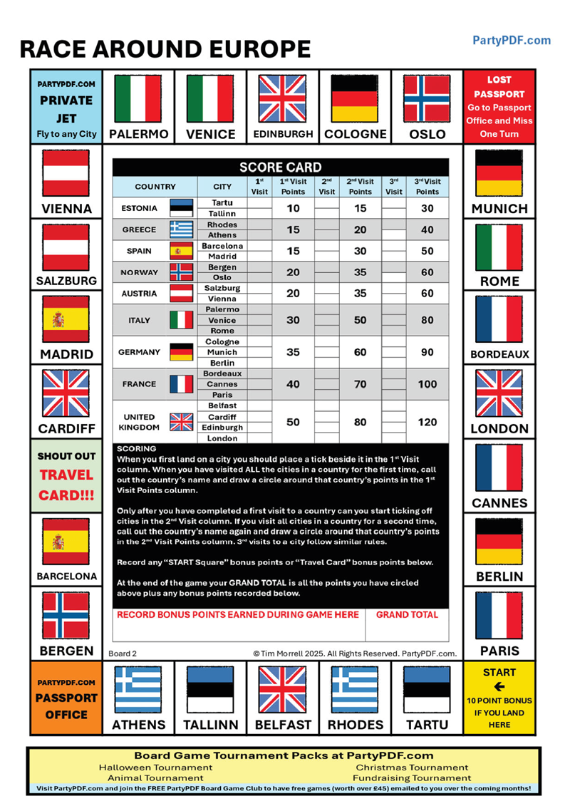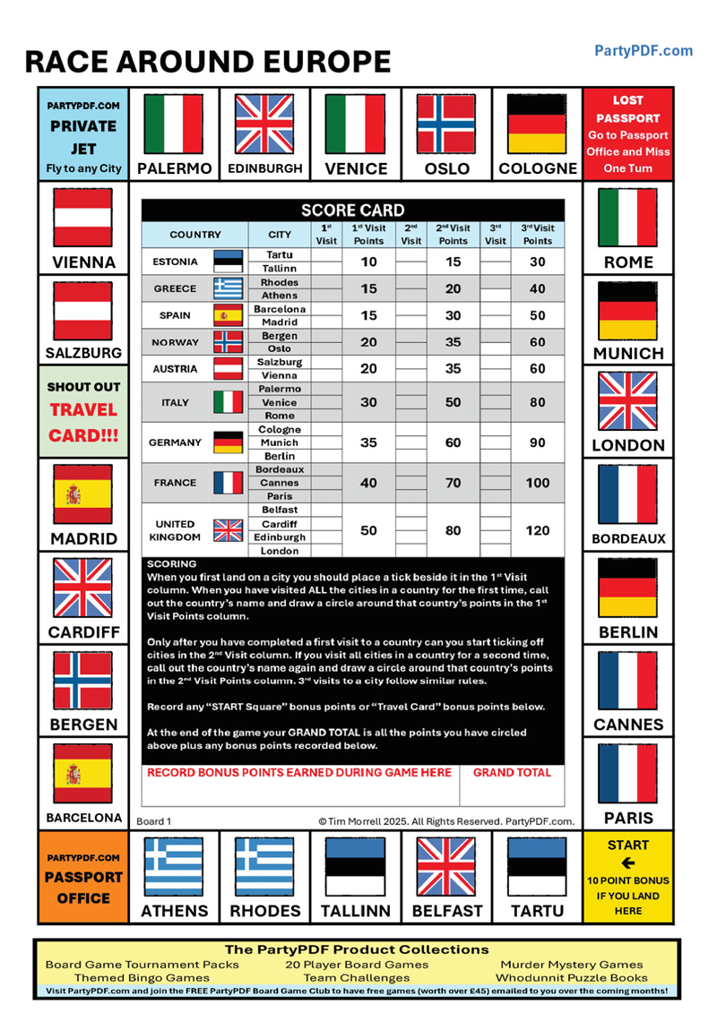 In this game players will be racing around a board made up of various European cities. They score points by visiting all the cities of a particular country. There are also bonuses to score, a private jet to take advantage of, TRAVEL cards which may help or hinder their travel plans and the constant threat of losing their passport! 20 different playing boards are provided.