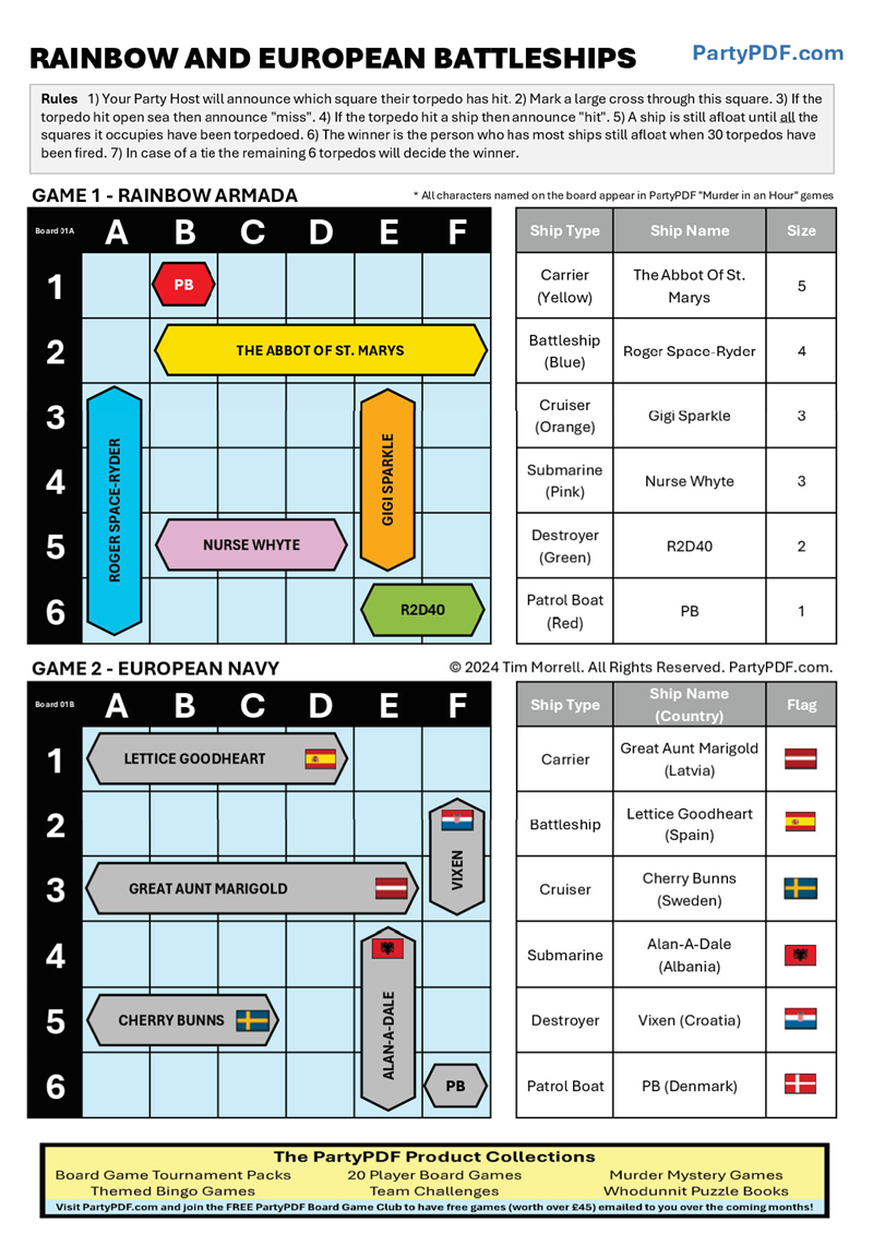 In this game players have a set of ships. Unfortunately the Game host has a set of torpedoes. 30 torpedoes will be fired. Players will then score points depending on how many of their ships are still afloat. 20 different playing boards are provided.