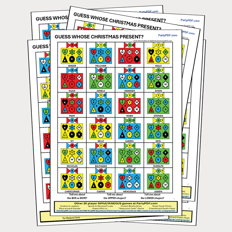 The presents on the different playing boards have been cunningly coloured! Answers will cause different players to eliminate different presents. In fact the answer to some questions may cause players to eliminate a different number of presents to each other. It is this unique colouring that allows 20 players to play the game simultaneously and yet obtain different results. However please be assured that an answer will never cause a player to eliminate the wrong present.