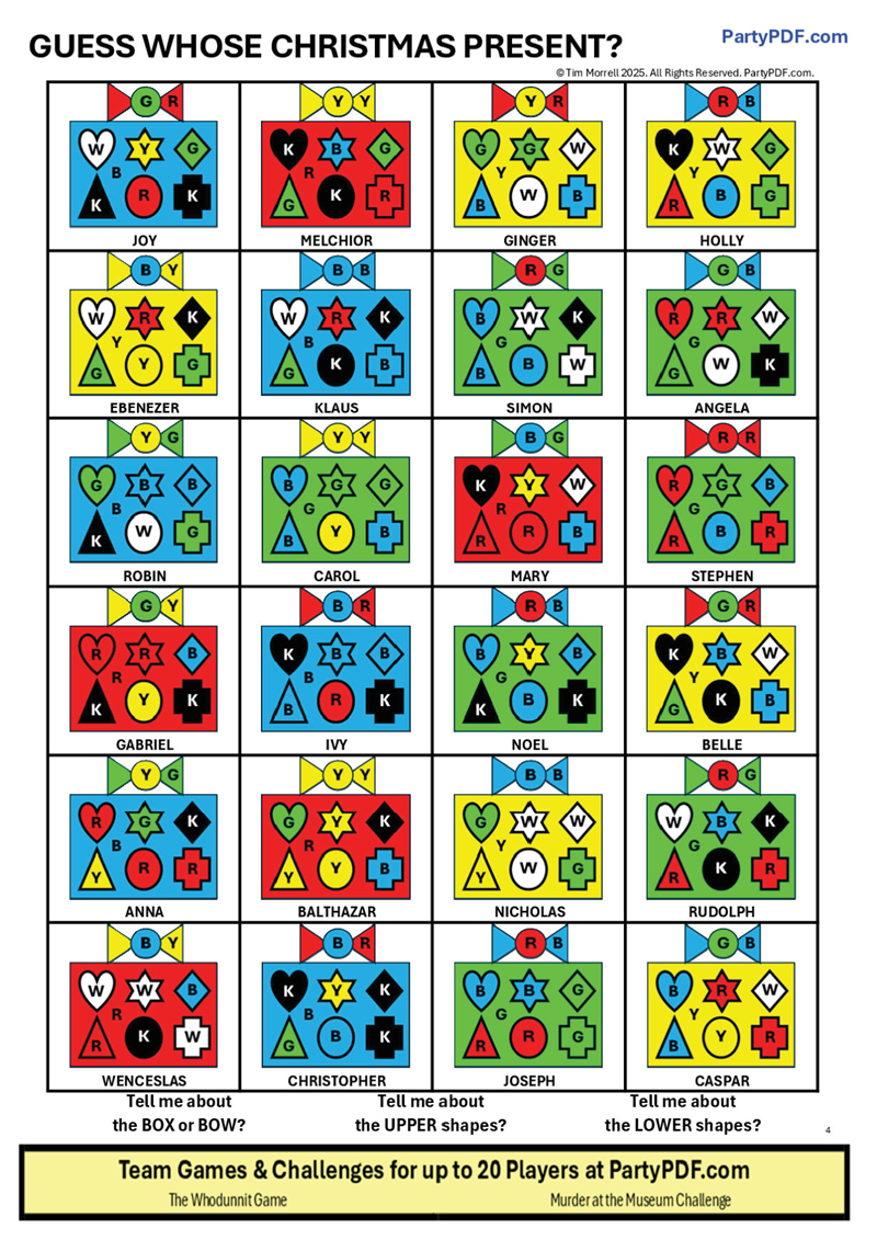 The Game Host, pretending to be Santa, secretly selects one of the presents. E.g. Angela’s present. They take the Angela Answer Card and announce “I am Santa and I have here a present. Guess whose present it is!”
