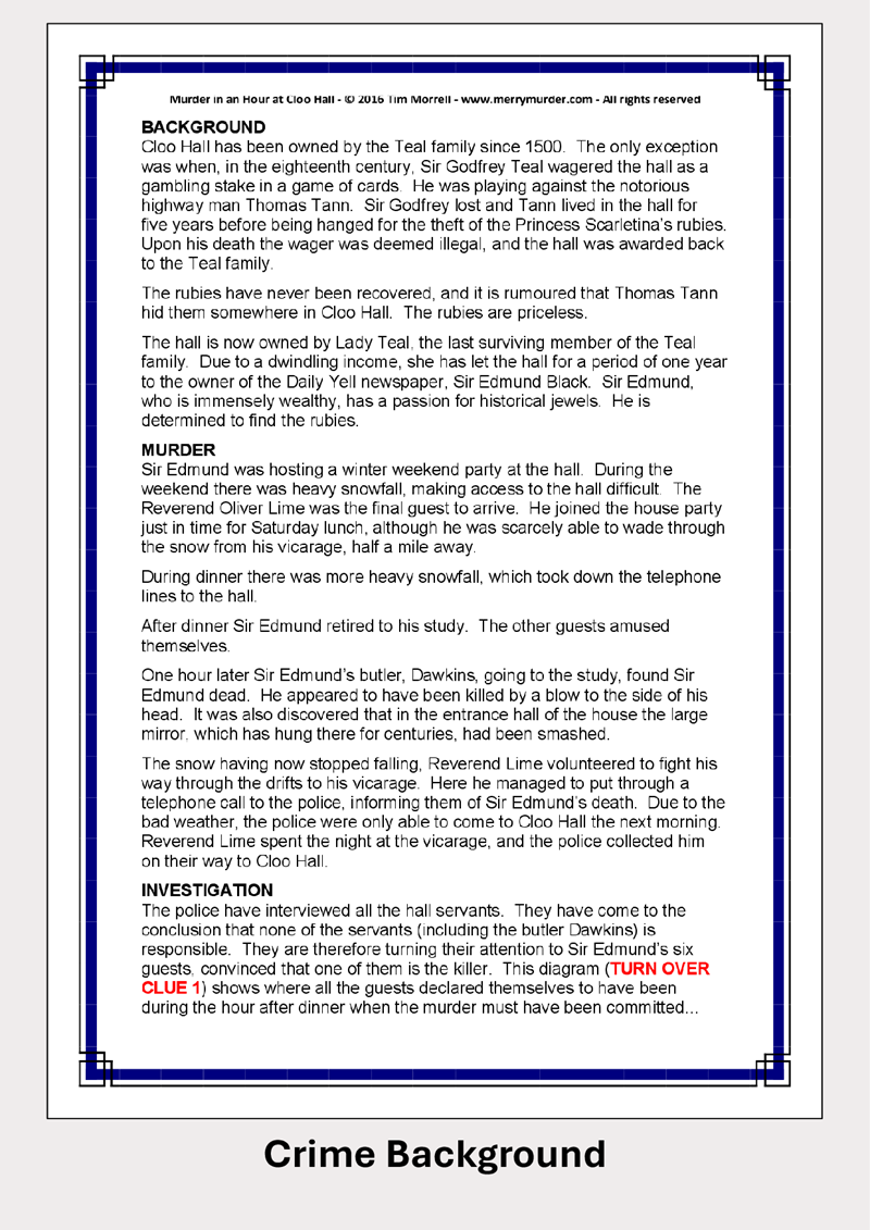 Sir Edmund Black, the wealthy newspaper owner, has leased the historic Cloo Hall. He hopes to find a dazzling ruby necklace, said to have been hidden there by the legendary eighteenth century highway man, Thomas Tann. But during a snowy winter weekend house party, Sir Edmund is found dead. Murdered in his study. And Police Investigators need to work out how he was killed - and which one of his six house party guests is the killer!