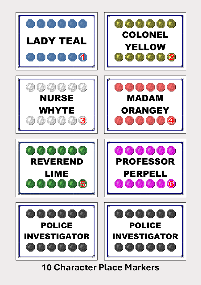 6 suspects, 14 Investigator Questions, 8 Clue Objects