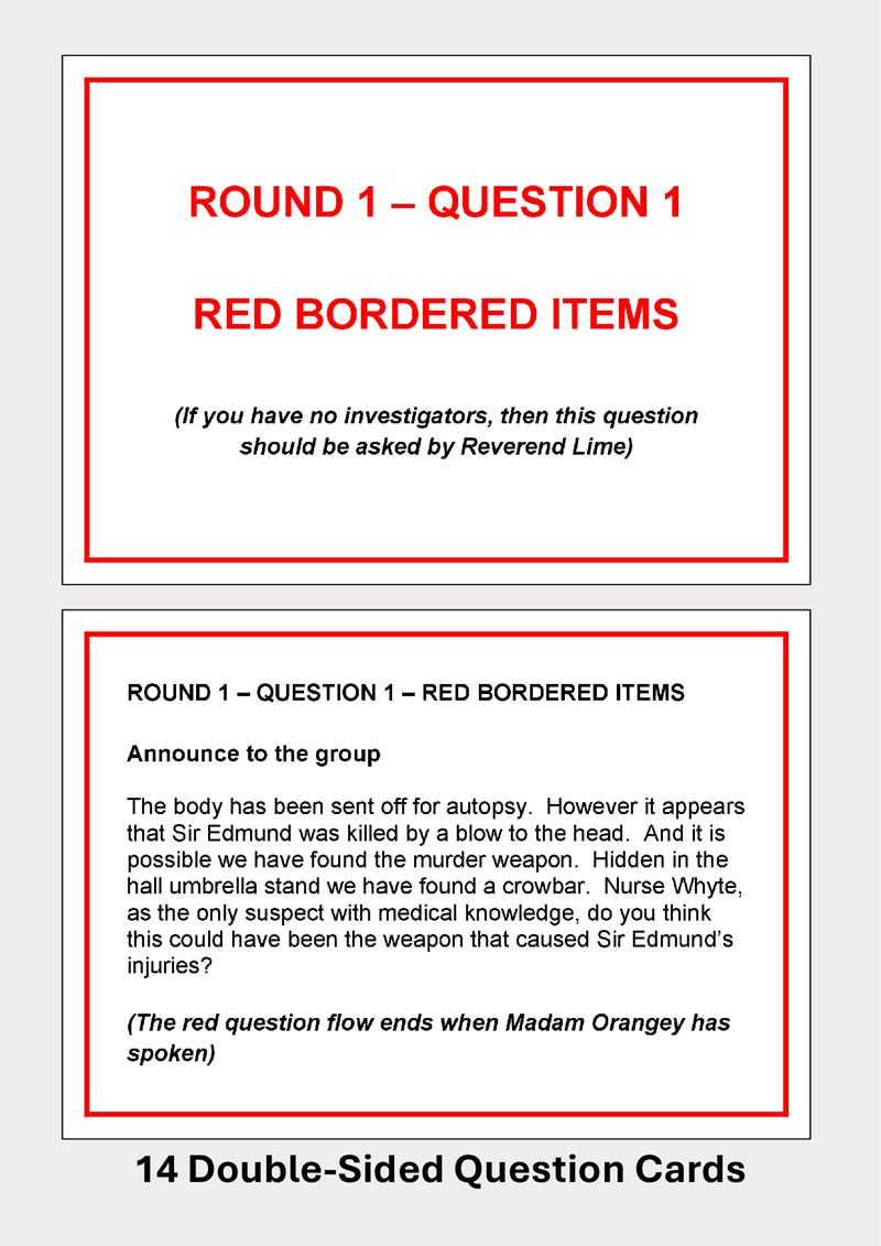 The Zoom Version of this game allows you to play over Zoom/Microsoft Teams etc and is therefore ideal if your players cannot meet in person. Each person has their own PDF file which contains their character's questions and responses. Each file also contains all the clues. When it is time to view a particular clue a link in their booklet will take them to the clue. Once they have viewed it a link beside the clue will take them back to the question/answer page they were originally on.