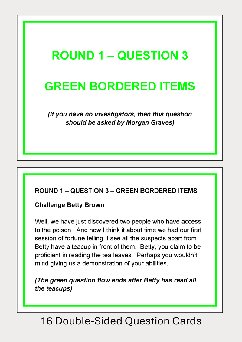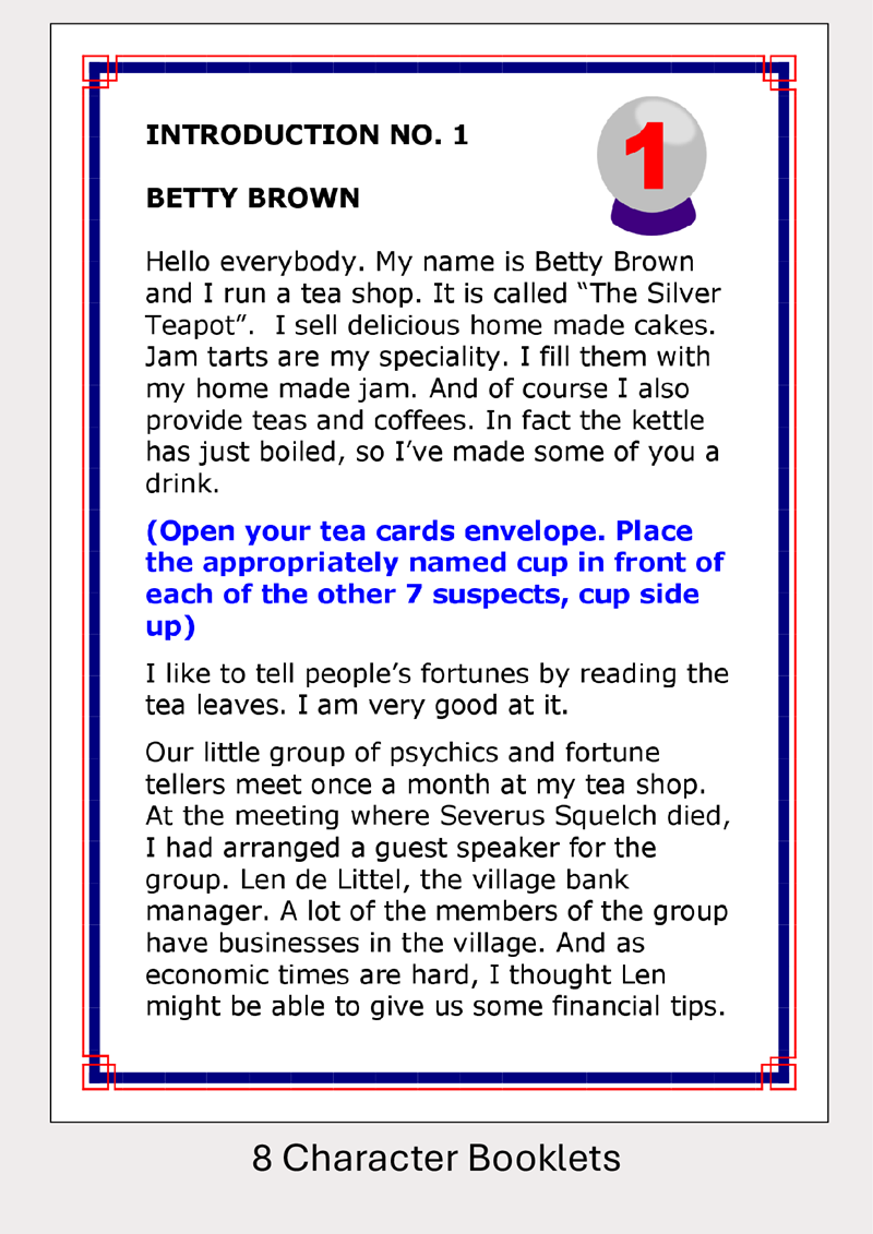 8 Suspects, 16 Investigator Questions, 2 Clue Objects, 7 "Psychic Ability" Scripts