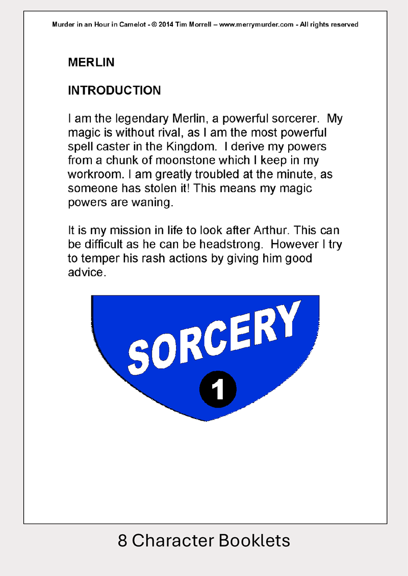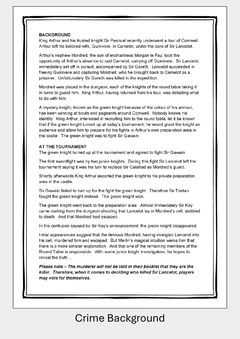 Camelot is in disarray! Mordred, evil nephew of King Arthur, has escaped from his place of captivity in the castle dungeons. And his guard, Sir Lancelot, lies stabbed to death in Mordred's open cell. First impressions would suggest that Mordred, having inveigled Sir Lancelot into his cell, killed him and then made his escape. But Merlin's magical thumbs are prickling, warning him that the solution is not so simple. A Panel of Knight Investigators are going to help him solve the crime.