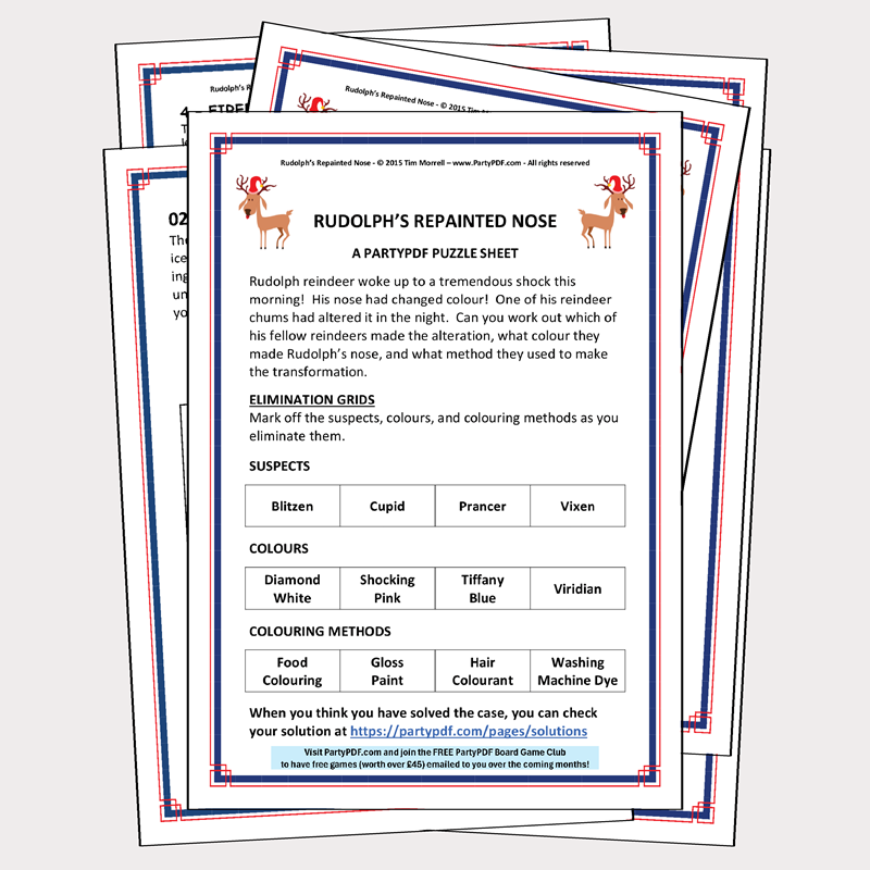 Rudolph reindeer woke up to a tremendous shock this morning! His nose had changed colour! One of his reindeer chums had altered it in the night. Solve the 5 puzzles and see if you can you work out which of his fellow reindeers made the alteration, what colour they made Rudolph’s nose, and what method they used to make the transformation.