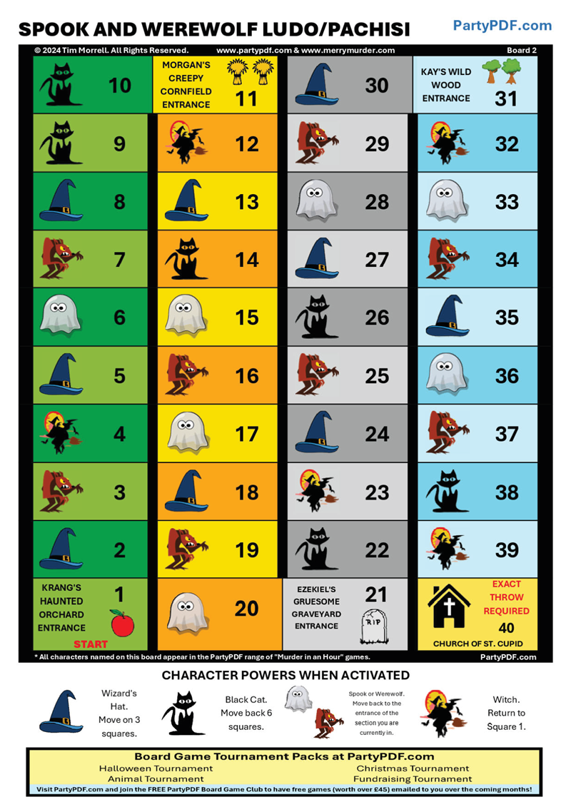 The party host will roll the dice again to activate one of the above characters. They will call the name of the activated character aloud. All playing pieces currently on a square featuring the activated character must take the appropriate action. E.g. if the black cat is activated, all playing pieces on a square containing a black cat must move backwards 6 squares.
