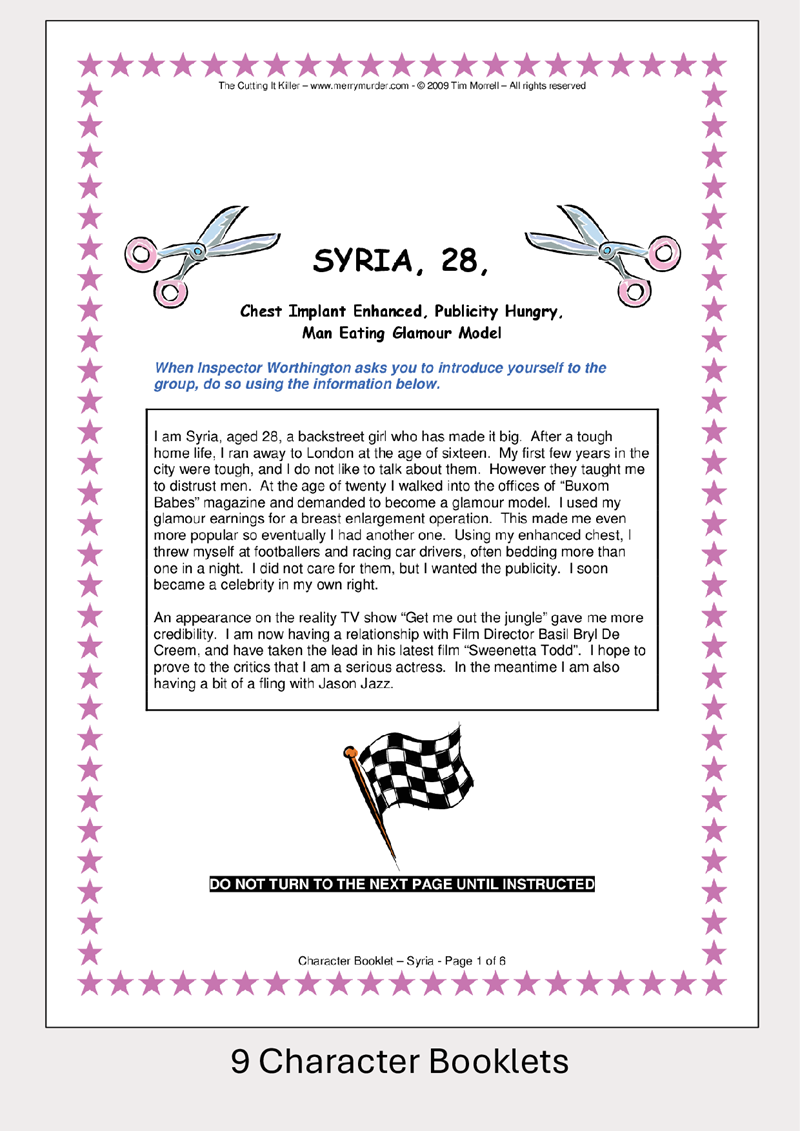- Suspects. It is from these named characters that the murder/murderers will be found. Each suspect has their own character booklet. They will be providing answers when quizzed by members of the investigation panel.