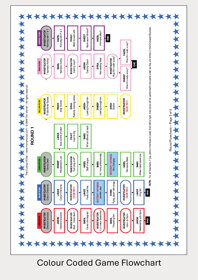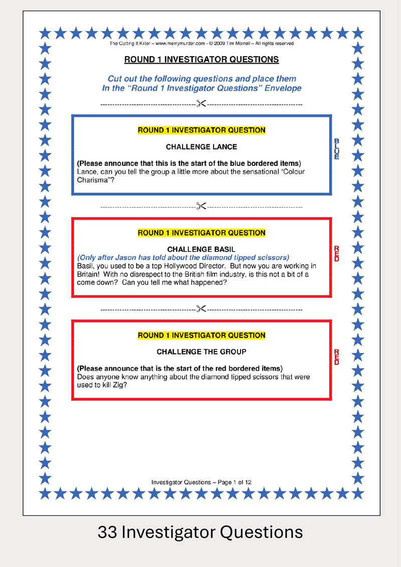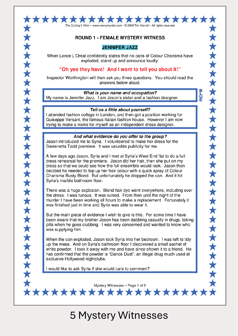 - Panel of Investigators. These players will be discovering the clues and asking the questions. They will be given investigation question cards that they will share out amongst themselves. They will be using these to question the suspects and possibly the chief investigator. They may also be asked to portray "mystery witnesses". These named characters appear for one round only and, when questioned by the chief investigator, provide unexpected and surprise information.