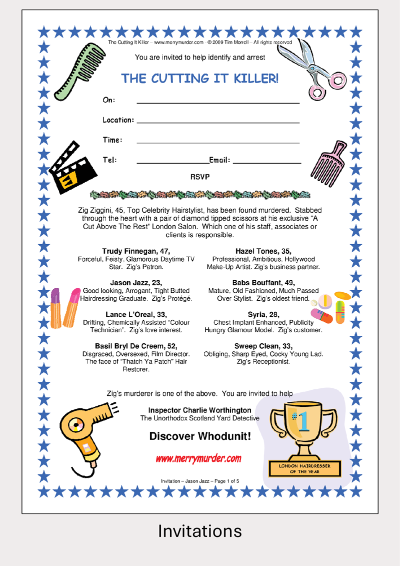 - Whodunnit Puzzle Sheet. A much simplified version of the Whodunnit Puzzle Books, these puzzle sheets can be attempted by players while waiting for other guests to arrive. They also make excellent challenges for children. Subscribers to the PartyPDF Mailing List can downloaded them for FREE using the discount code PartyPDF. You can subscribe to the mailing list by clicking here.